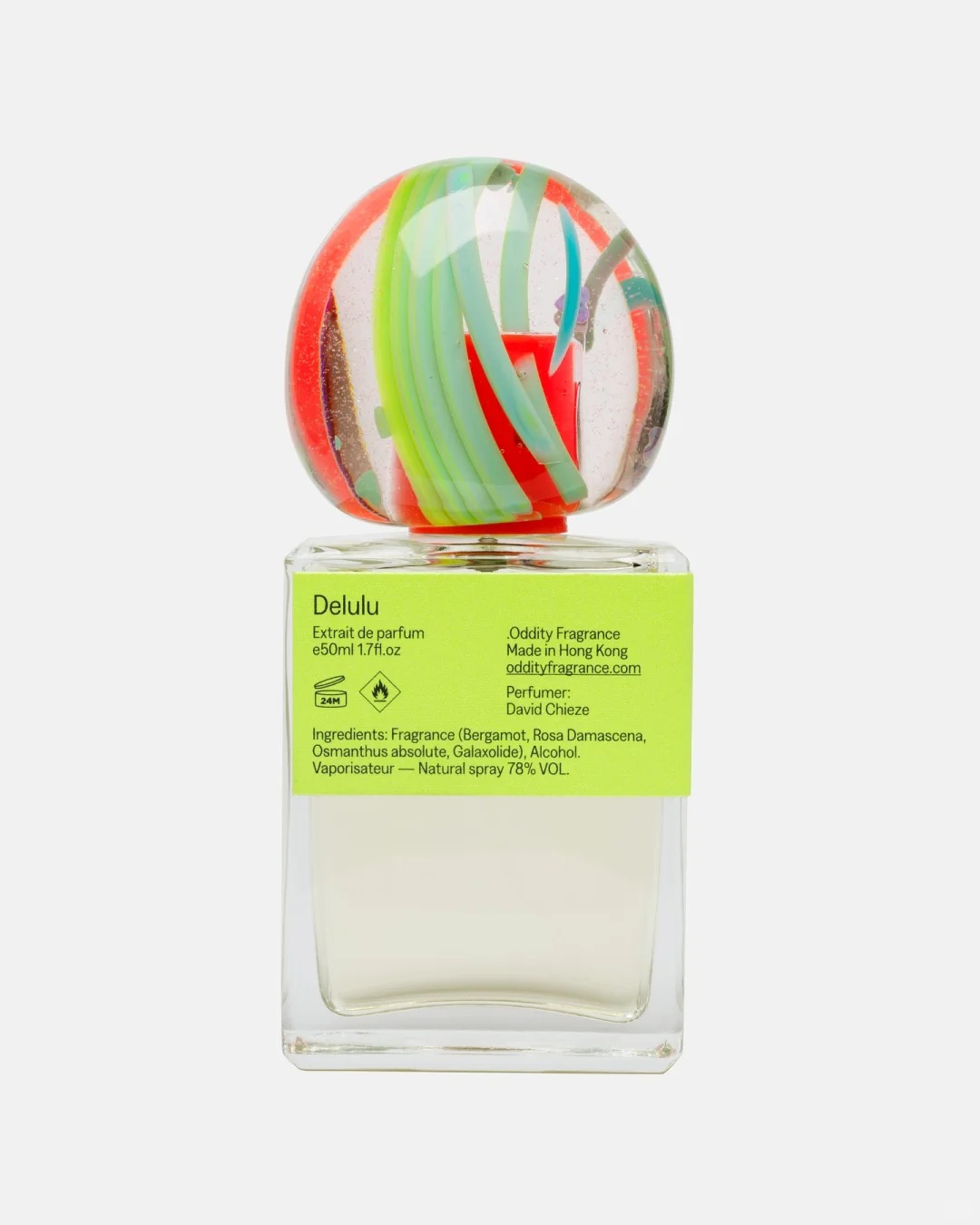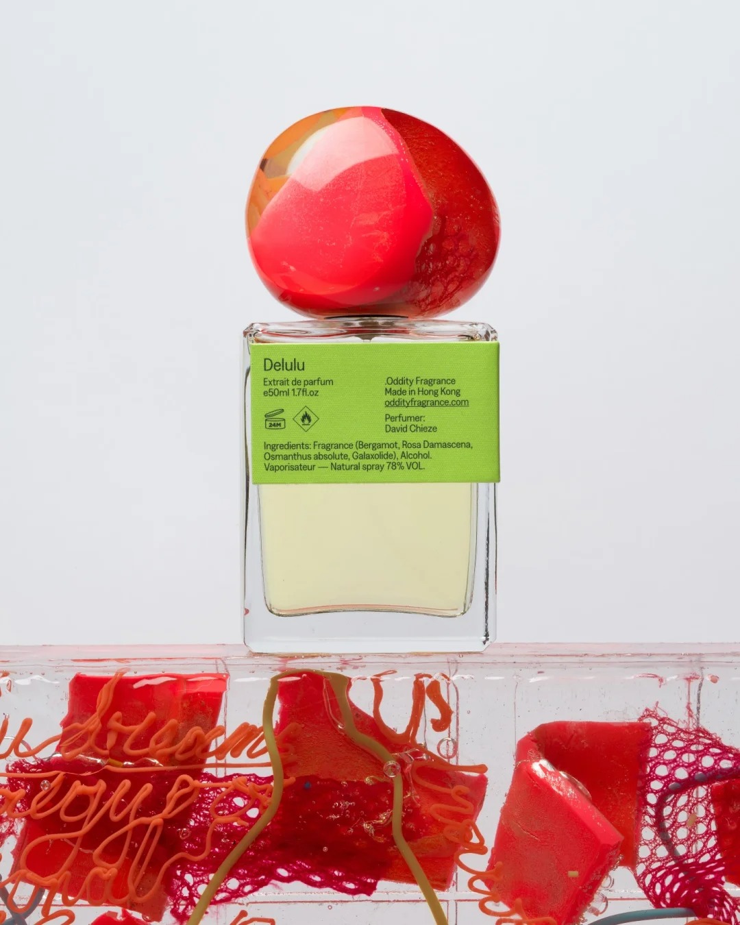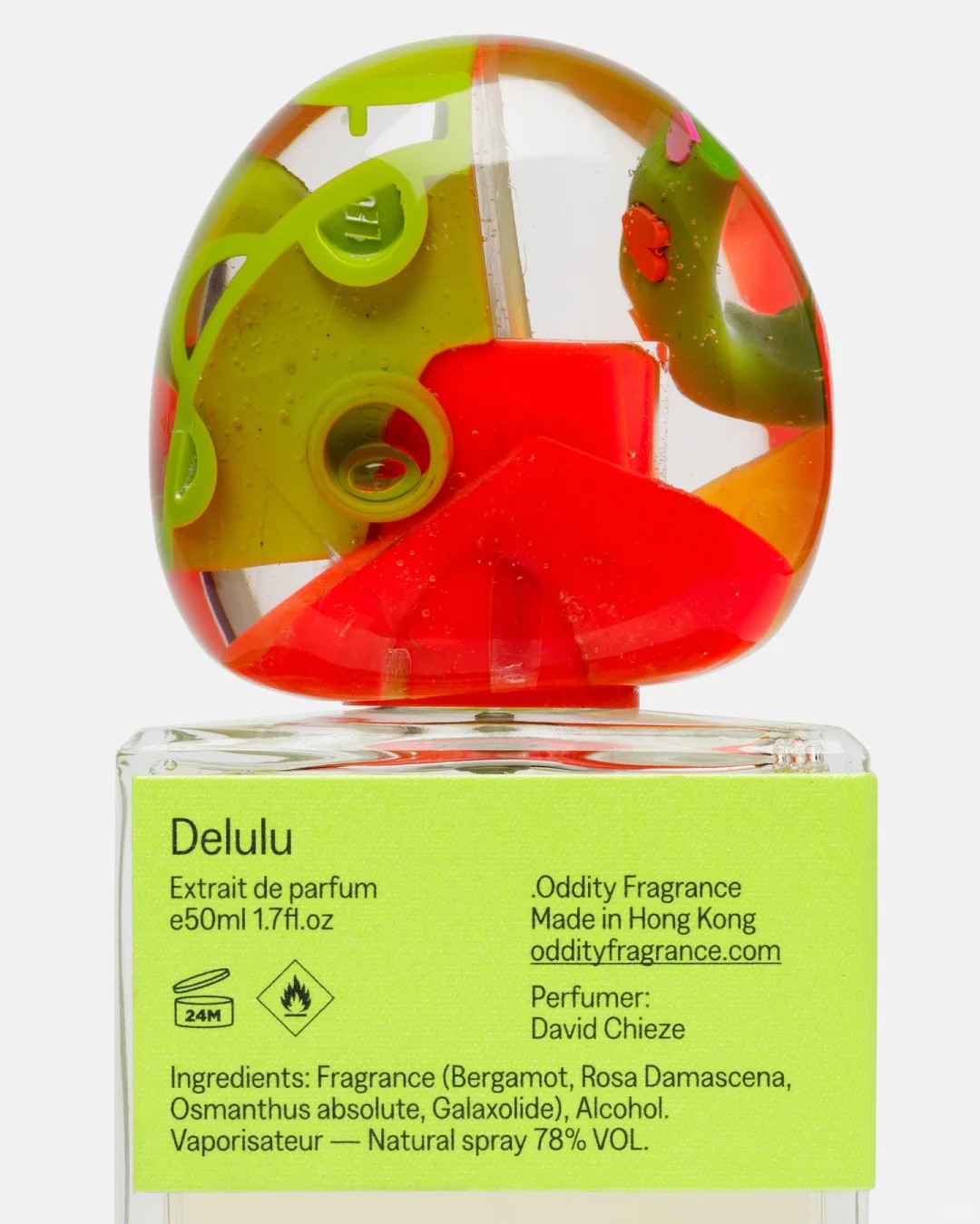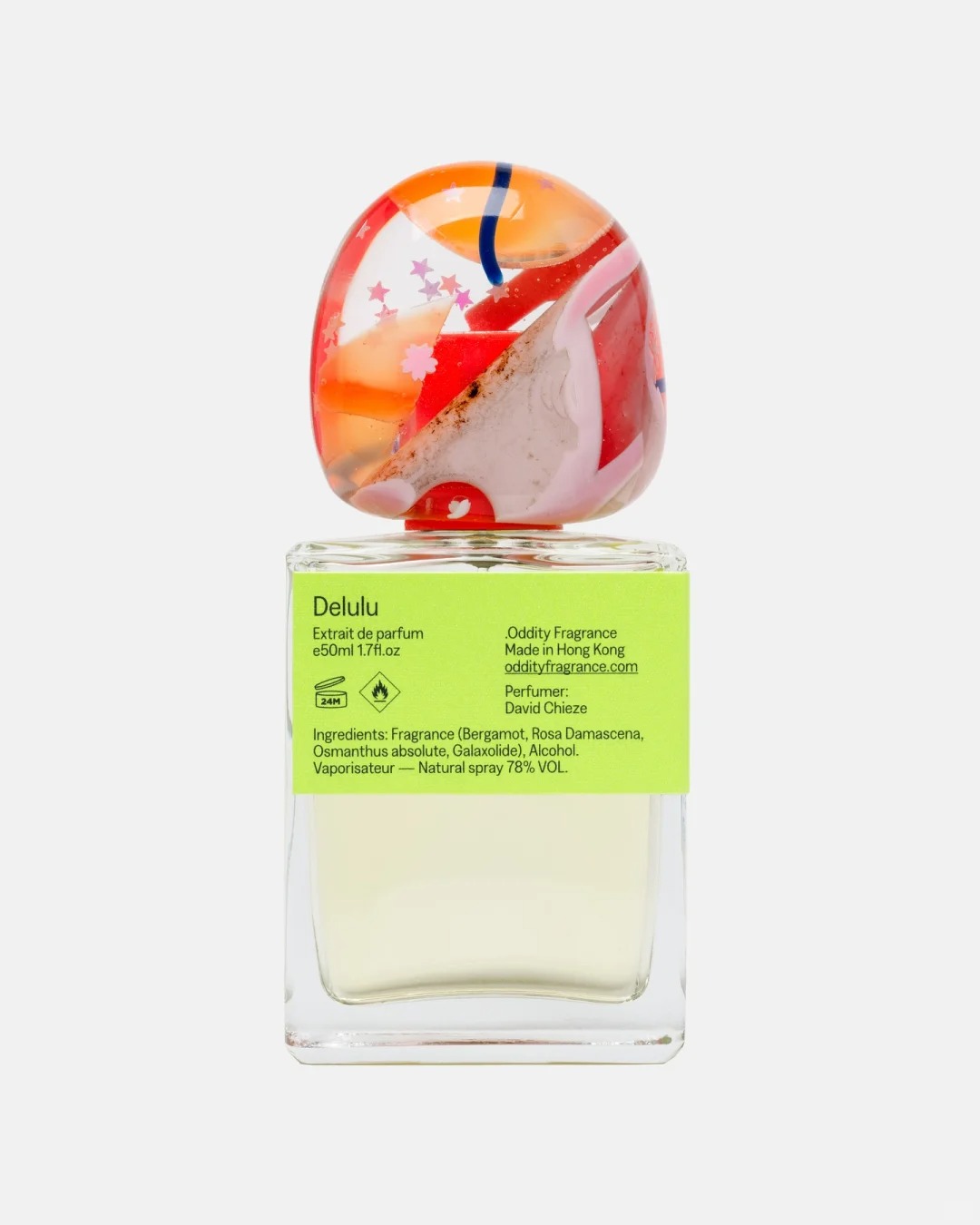 来自Oddity Fragrance的第四个香水系列Delulu,为不想长大的成年人设计 味道酸酸甜甜,大黄、橘子、覆盆子、玫瑰、桂花… 包装则比香味更可口,主创人员用从海岸、废弃建筑物还有二手商店里收集来的塑料、玩具零件,打造出弹珠般的香水帽