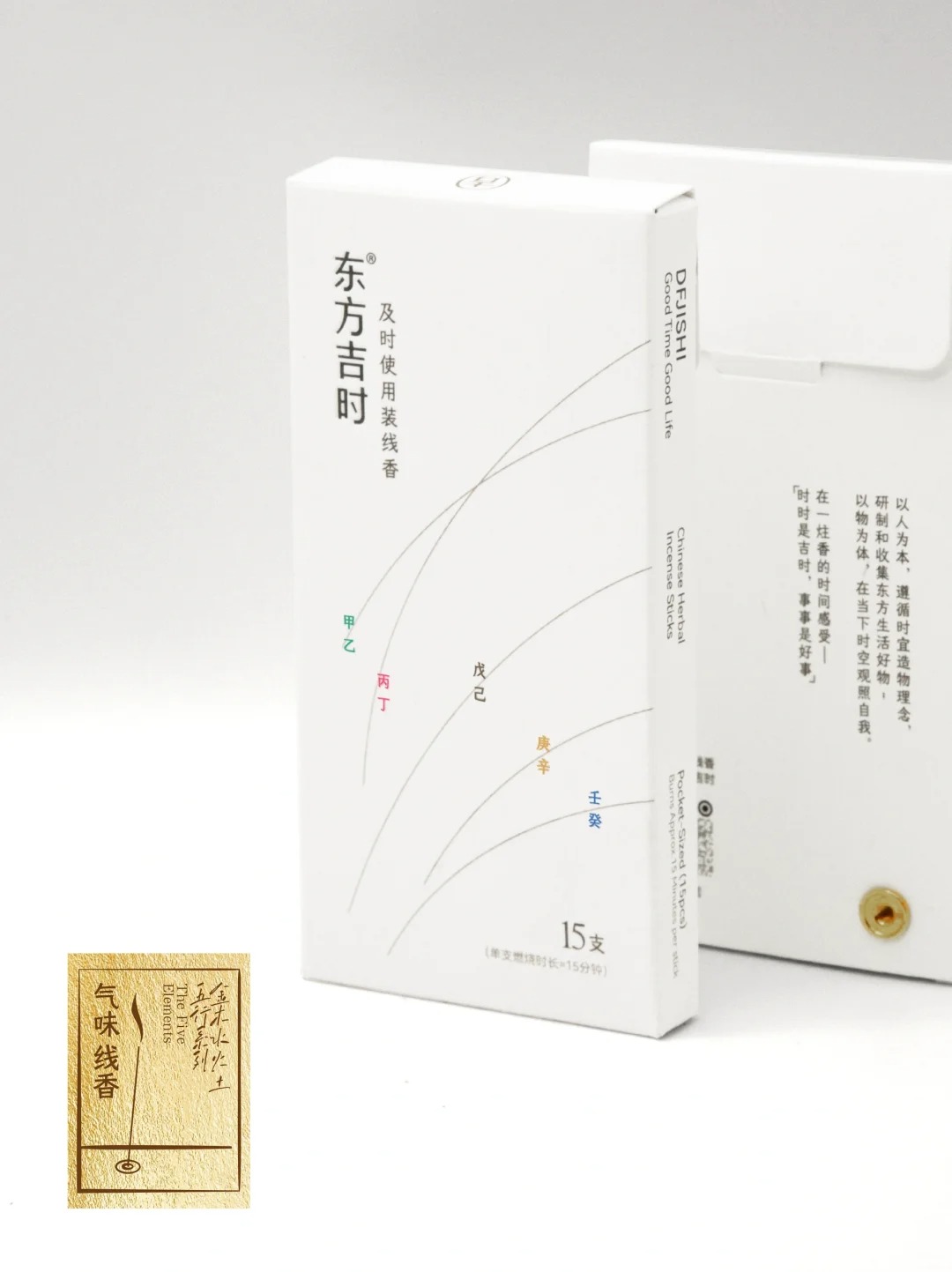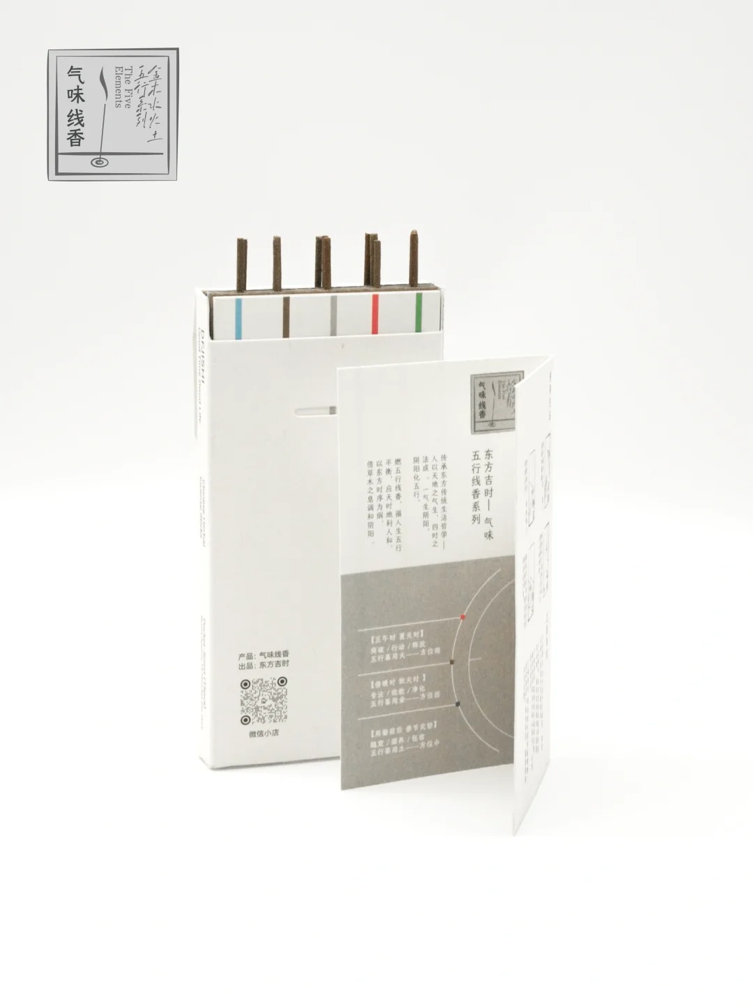 东方吉时的定位是覆盖全生活场景的东方生活方式品牌。品牌先从“东方嗅觉”出发,以时辰与五行为基础概念。第一阶段的产品围绕“五行线香”展开。由于产品上新的时间线原因,对logo进行了简单的设计。更主要的精力集中在线香的包装上。
