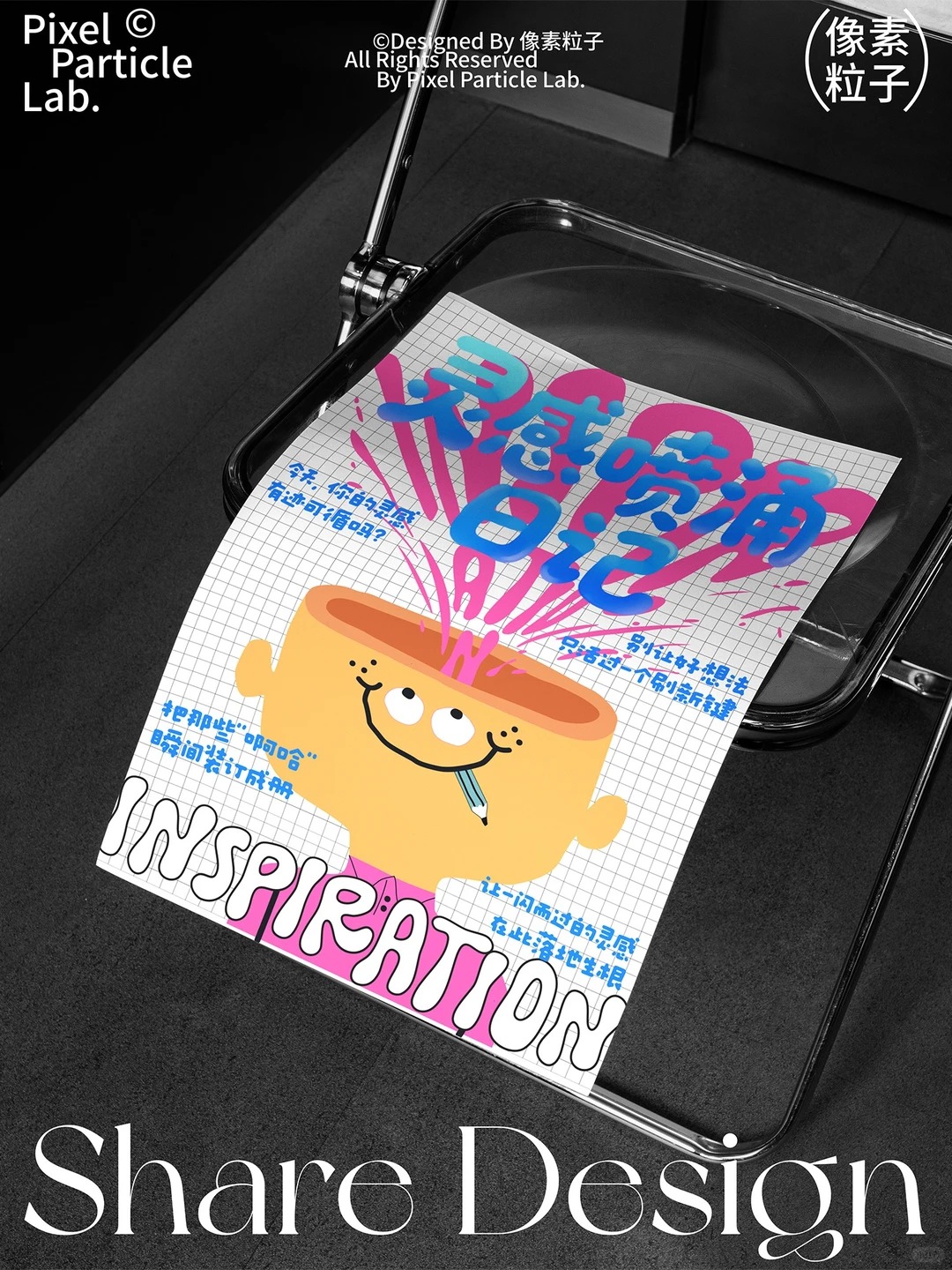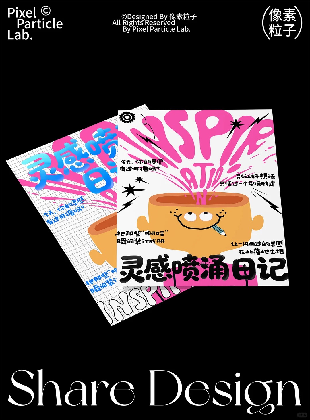 ❶ 文字图形化 “inspiration”一词拆解重构 用喷发线条替代字母“inspiration”,视觉化表达“涌现”状态 ❷ 色彩情绪搭配 柔和粉(喷发线条)搭配冷静蓝(标题色) 柔和粉(喷发线条)搭配纯黑色(标题色) ——形成“热情-创意-理性”的情绪动线 ❸ 双重视觉版本 同一主题下延伸两种排版 方格底纹版(活泼创意感) 纯白底版(干净聚焦感) ❹ 符号隐喻设计 卡通大脑 → 创意的发源地 喷发笔触 → 灵感持续输出 悬浮铅笔 → 创作即将发生