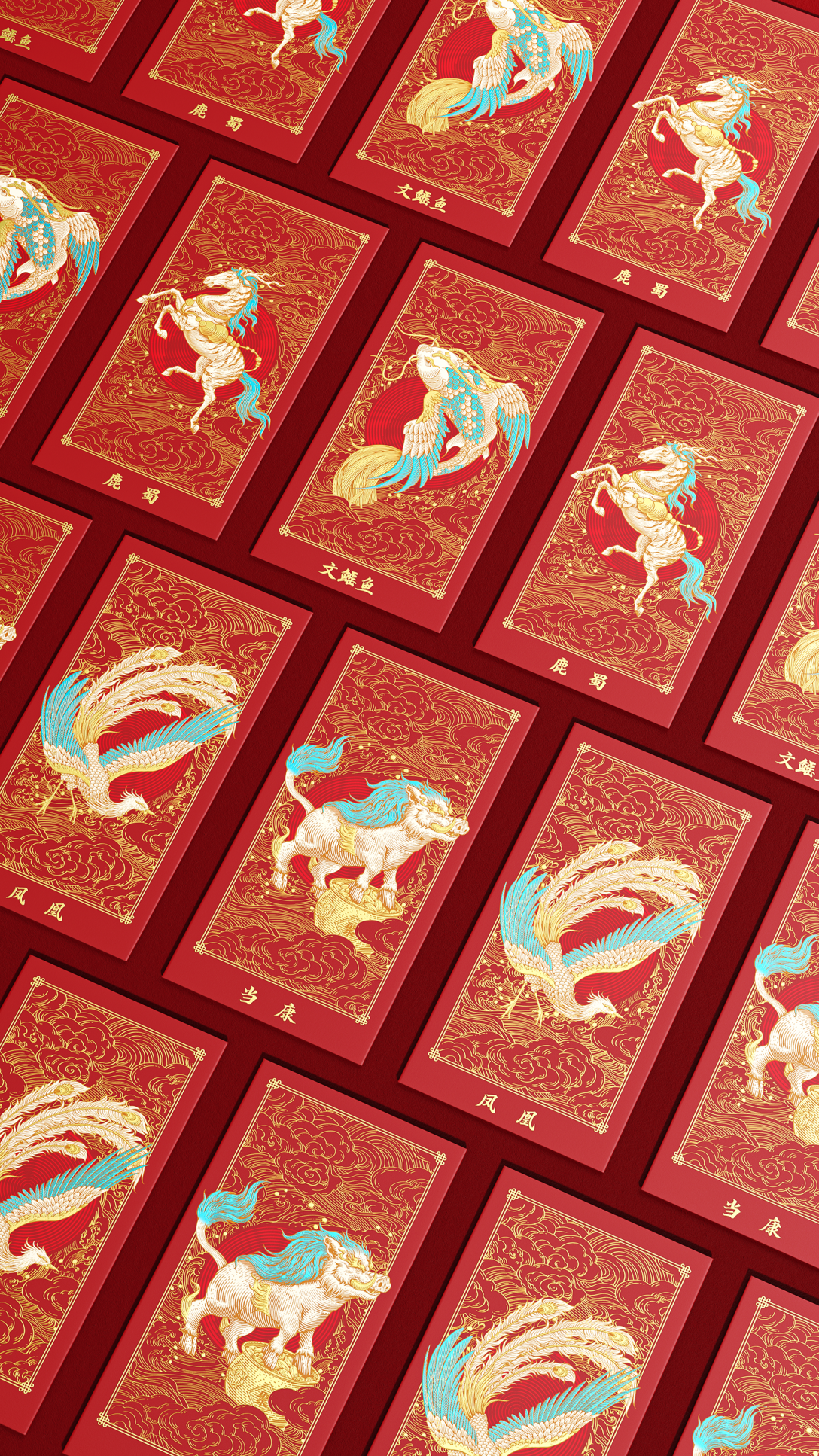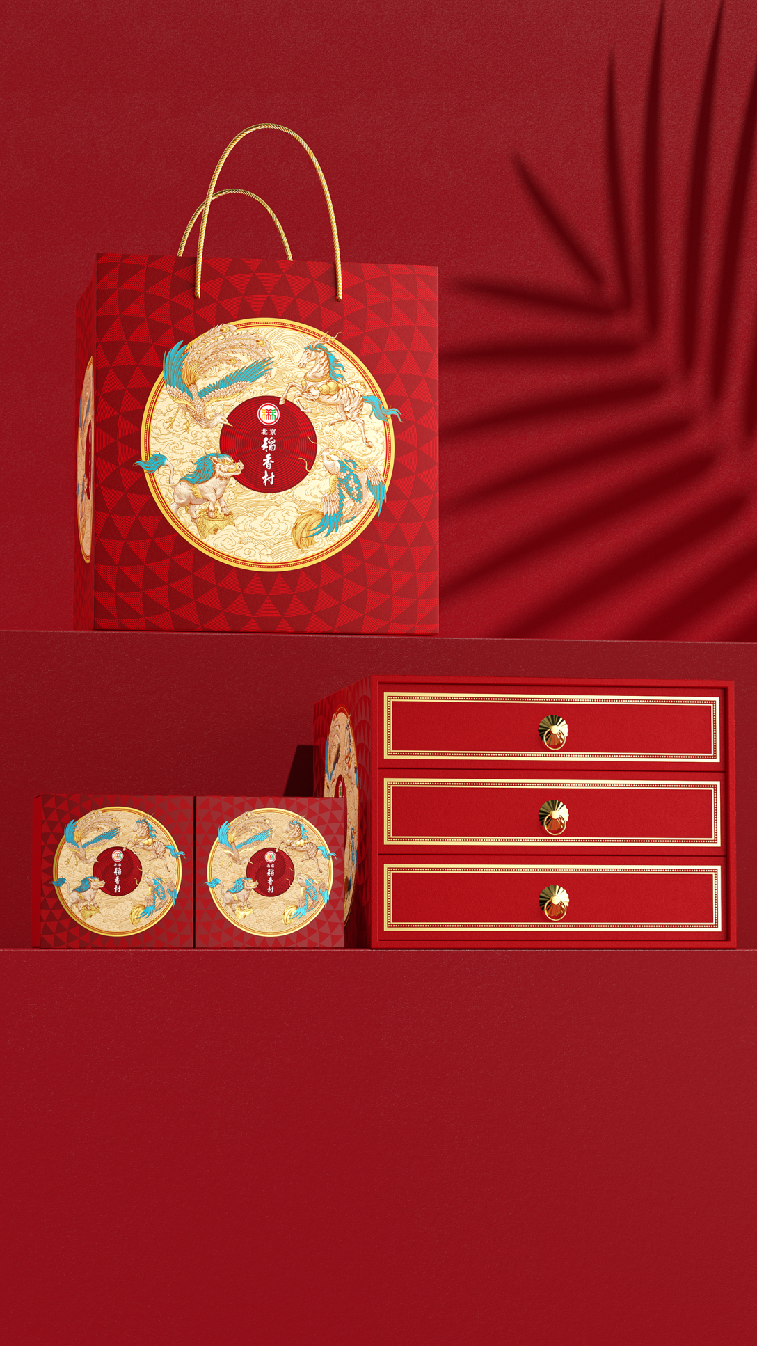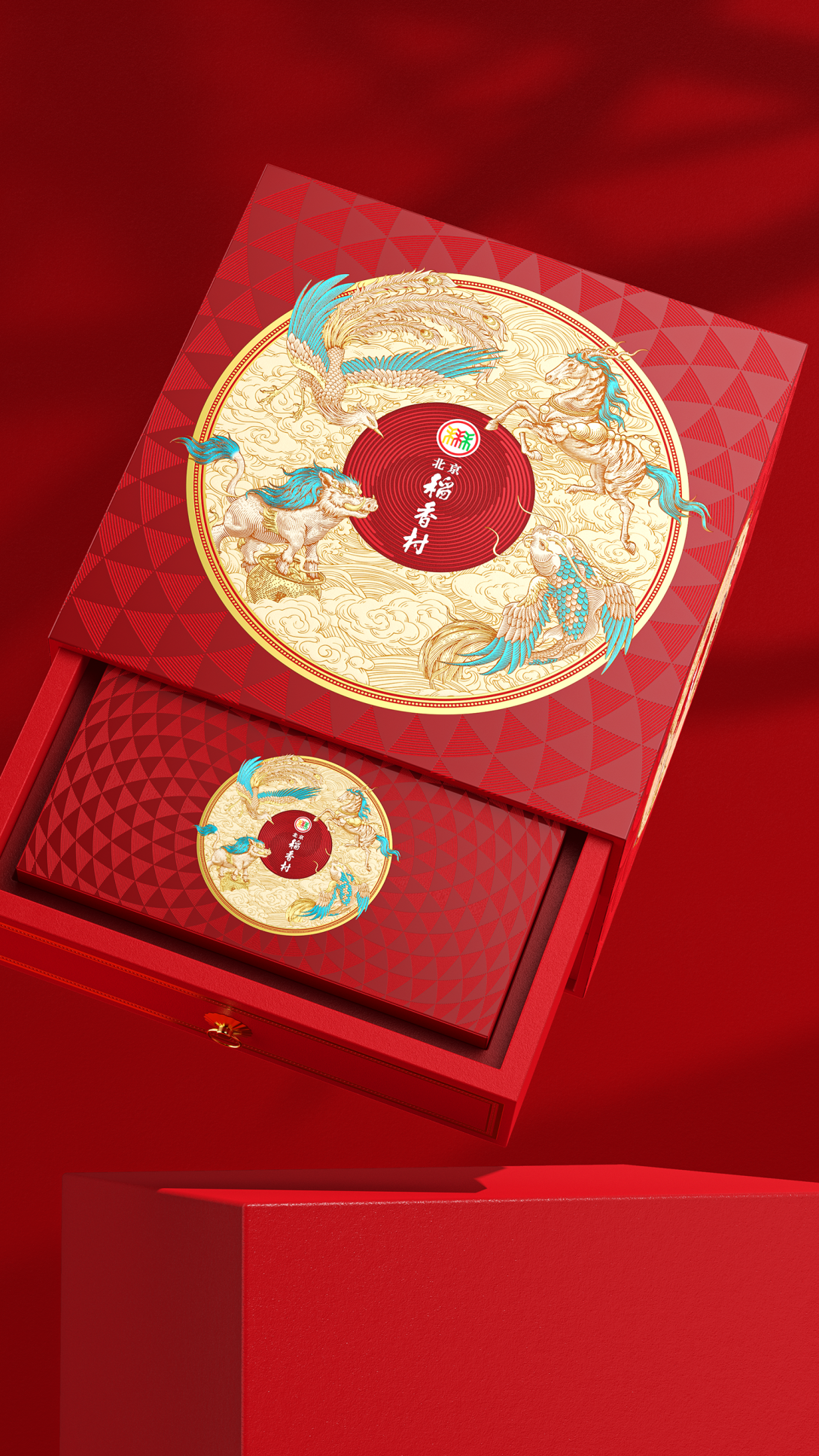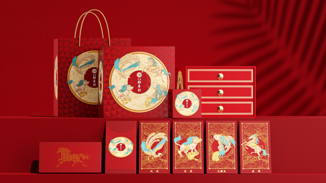 插画礼盒以《山海经》中的瑞兽为主题,主视觉采用螺旋式向心构图,引导视觉流向中心品牌标识。 画面层次分明,动势十足:最前景以水波纹开场,文鳐鱼破水而出,其飞跃之姿带动初始动线;随后,瑞兽鹿蜀轻盈跃升,其身姿承接并强化了螺旋的流转轨迹;凤凰于空中俯冲盘旋,羽翼指引方向;底下的当康稳立于丰收大地,仰首呼应,收拢全局。四瑞兽【文鳐鱼、鹿蜀、凤凰、当康】动态一气呵成,构成一股凝聚的祥瑞之力,象征着百川归海、万瑞来朝,共同守护并传达稻香村所承载的丰饶滋味与诚挚祝福。