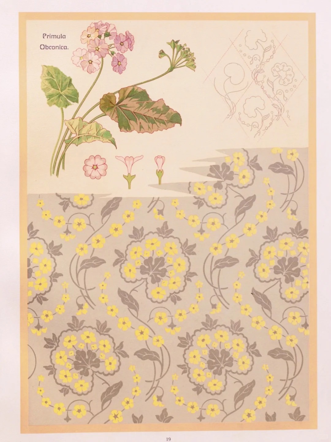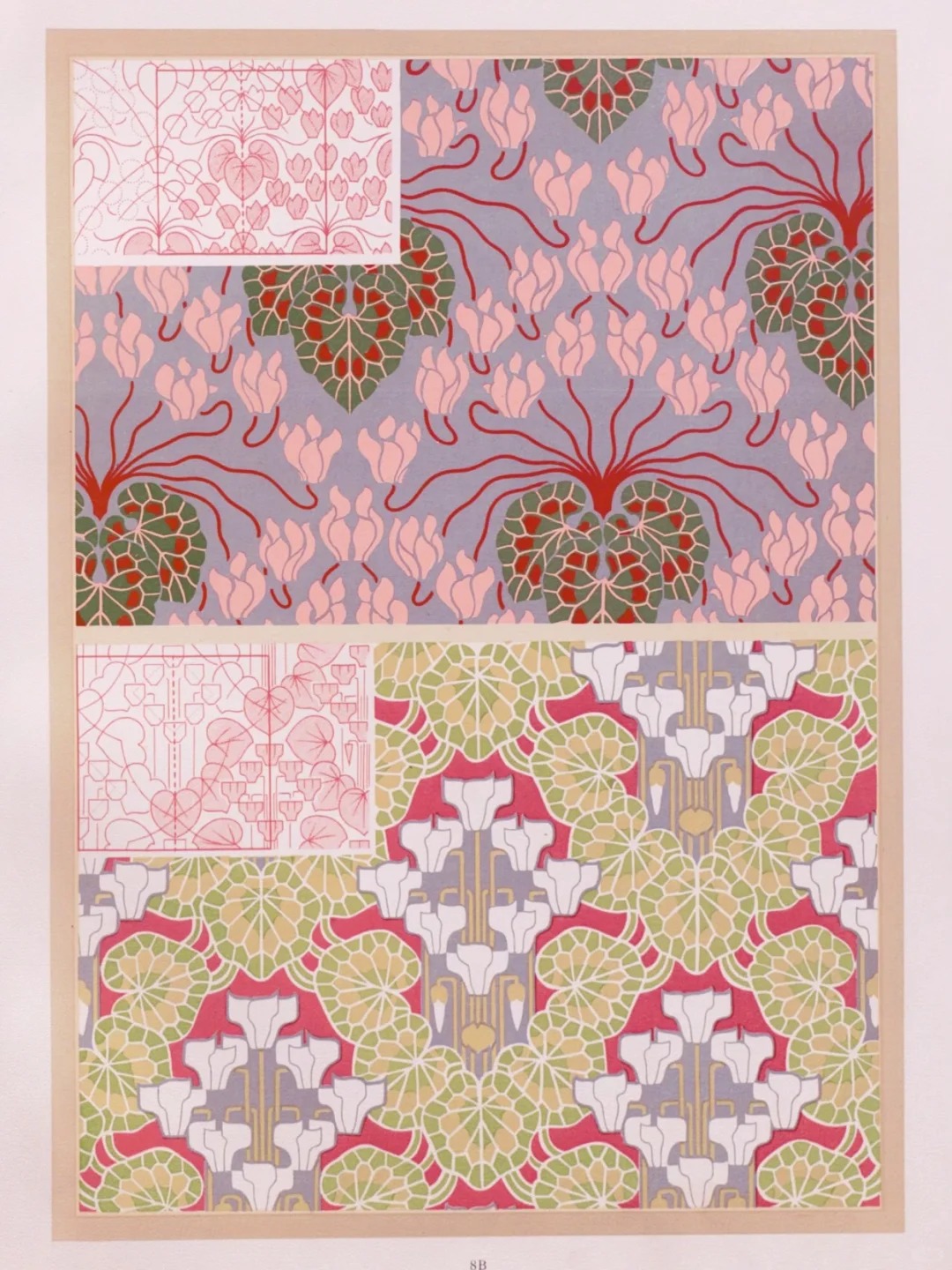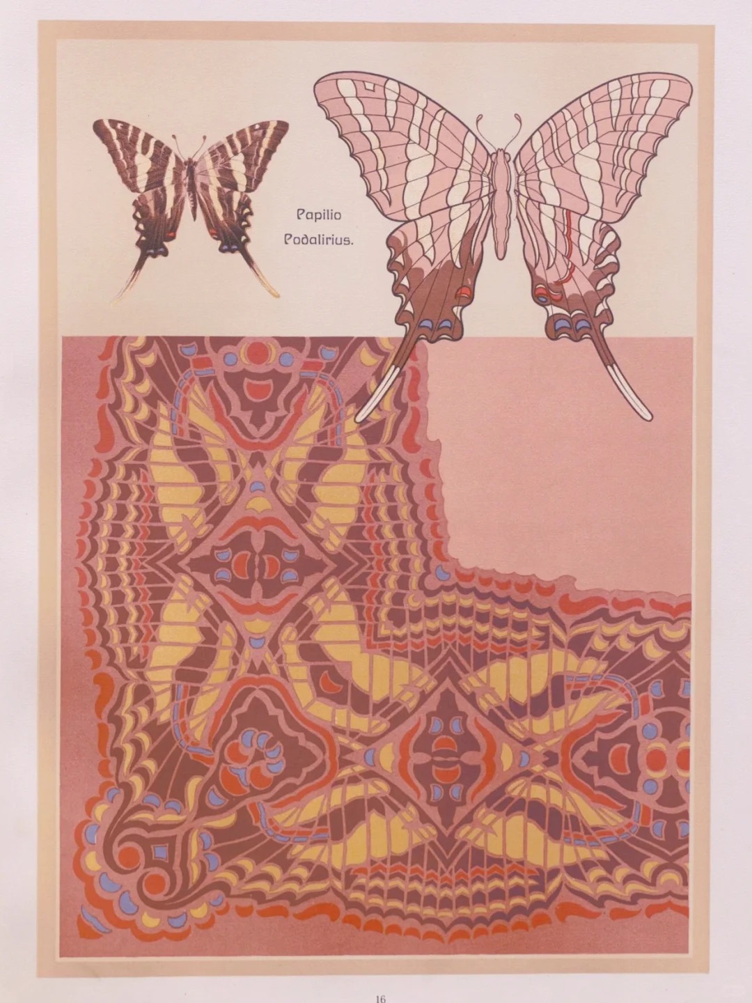 1906年出版的《自然研究与构图》,作者托马斯·韦格纳,以植物和昆虫为灵感,共有22幅新艺术风格插图,每一页都展示了元素的自然形态,接着是经风格化处理的漩涡状和弧形形态,最后是由这些形态构成的新艺术风格图案,色彩丰富,异常独特。