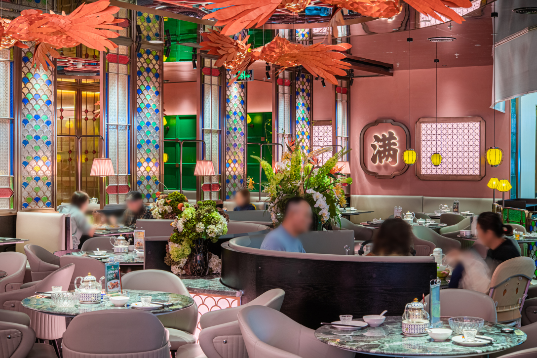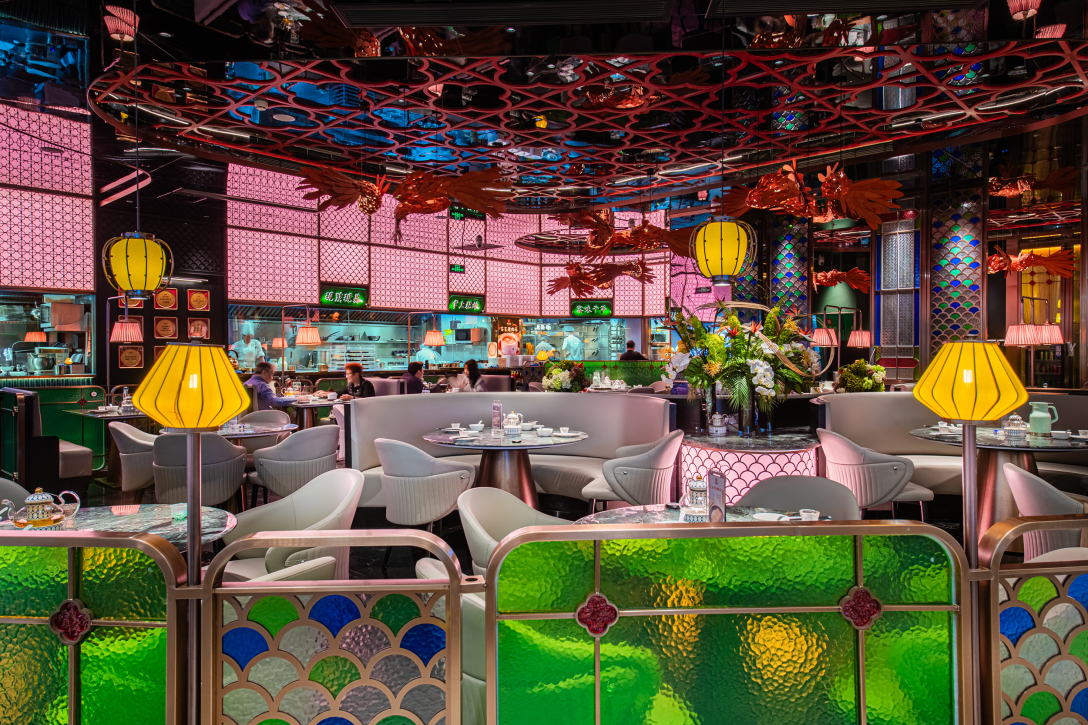 空间设计中,我们深度提取客家文化核心符号,完成现代化的创新表达:顶面以客家传统雕花格架为基底,搭配悬空的艺术锦鲤造型,既取客家文化「年年有余、客满盈门」的吉祥寓意,也成为极具视觉冲击力的空间核心记忆点,天然具备社交传播属性;提取客家围龙屋的弧形建筑肌理,融入包间吊顶、散台软包的设计中,唤醒本土客群的深层文化共鸣;墙面的渔耕文化艺术画作,将客家山水、围龙屋、本土人文融为一体,让文化从冰冷的装饰,变为可感知、可共情的空间内容。