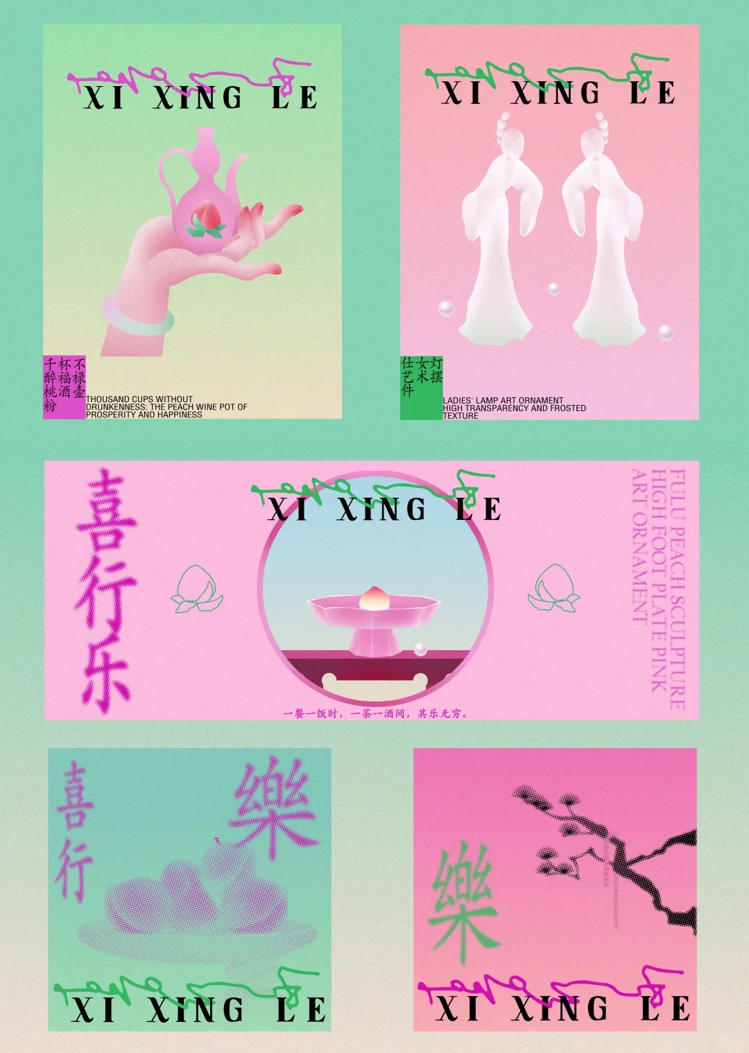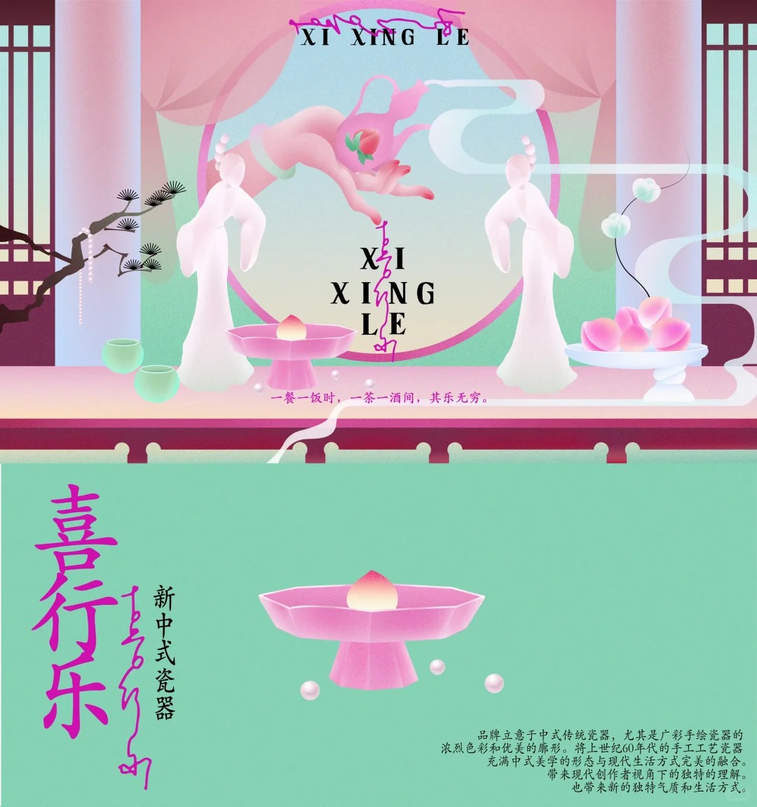 第一眼看到喜行乐瓷器的时候瞬间挪不开眼 高饱和度的色彩 融合仙桃、松柏、葫芦等传统文化元素,风格鲜明 取中式传统瓷器之魂 广彩手绘的浓艳色彩与优美廓形 将上世纪六十年代手工瓷器的韵味揉入当今生活 虚拟商业品牌创作 仅做学习分享)