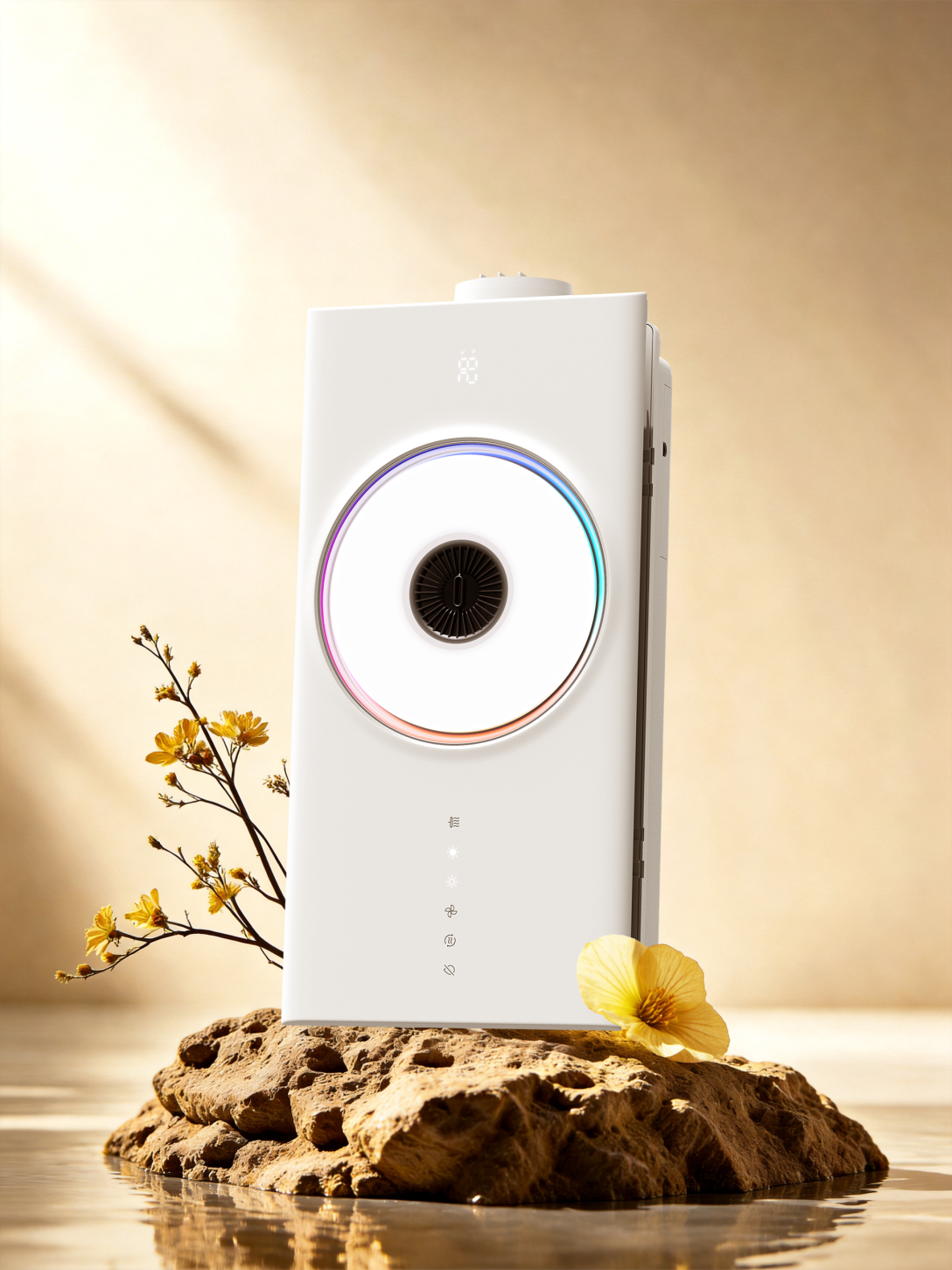 该浴霸以极简主义美学为核心,采用双暖风结构,外圈为扩散柔风,内圈为集中强风,可满足用户沐浴后吹干身体与头发的需求。整体以简洁几何形态塑造,内圈出风口融入奔驰汽车空调出风口的精致造型,外圈搭配隐藏式渐变RGB灯环,使产品兼具现代简约气质与未来科技感,呈现高端精致的视觉质感。