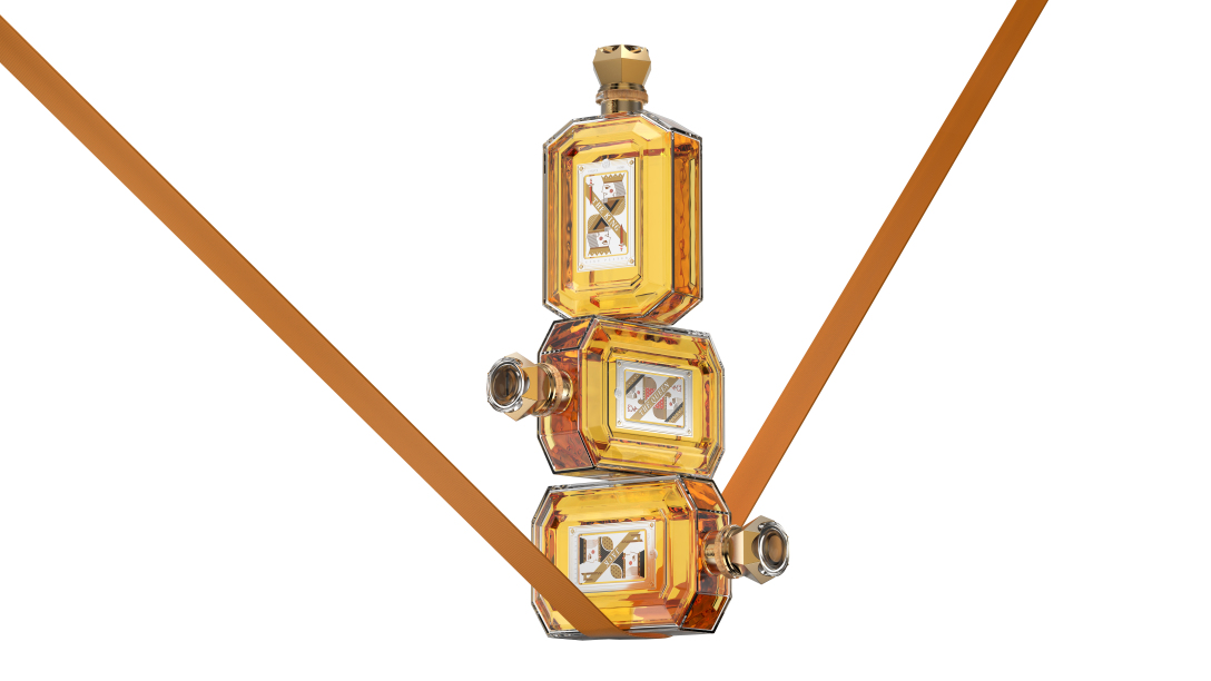 以“皇家扑克社交局”为创意概念,打造四款角色化产品(国王、皇后、侍卫、王牌 ACE),从视觉、结构到互动体验实现全维度创新。瓶身以钻石切面+扑克牌型为灵感,棱角分明的几何轮廓呼应扑克卡牌的硬朗线条,同时通过多面折射强化视觉张力。瓶盖统一采用皇冠造型,金属质感搭配宝石镶嵌,拧盖时仿若 “加冕”,将扑克主题的王权仪式感拉满。