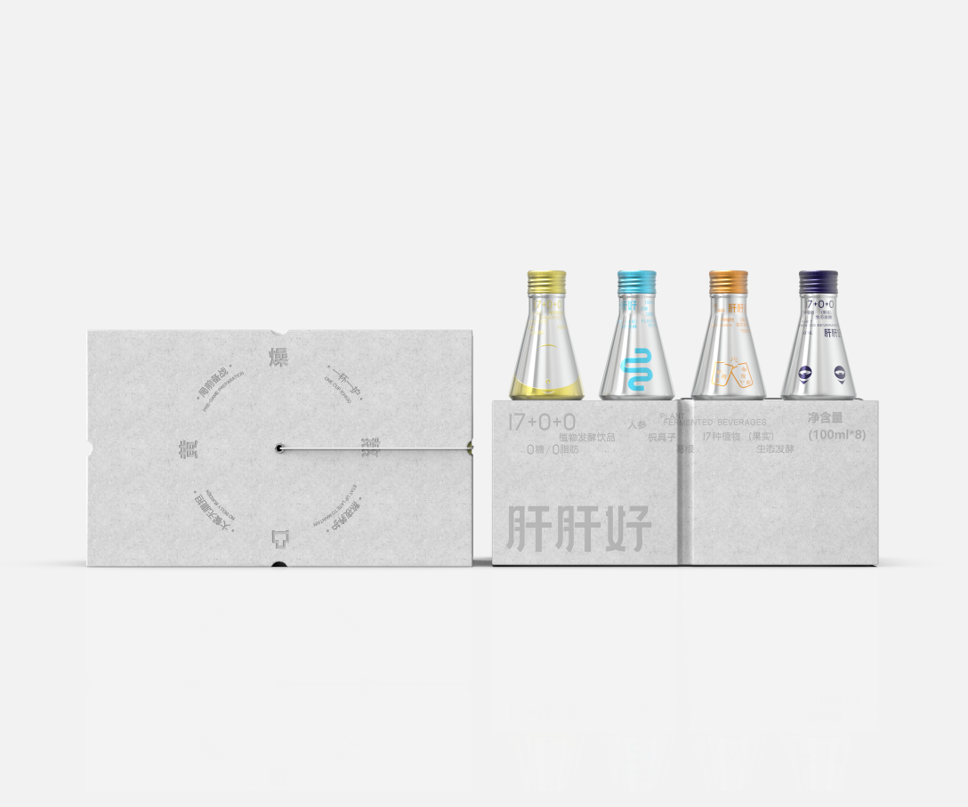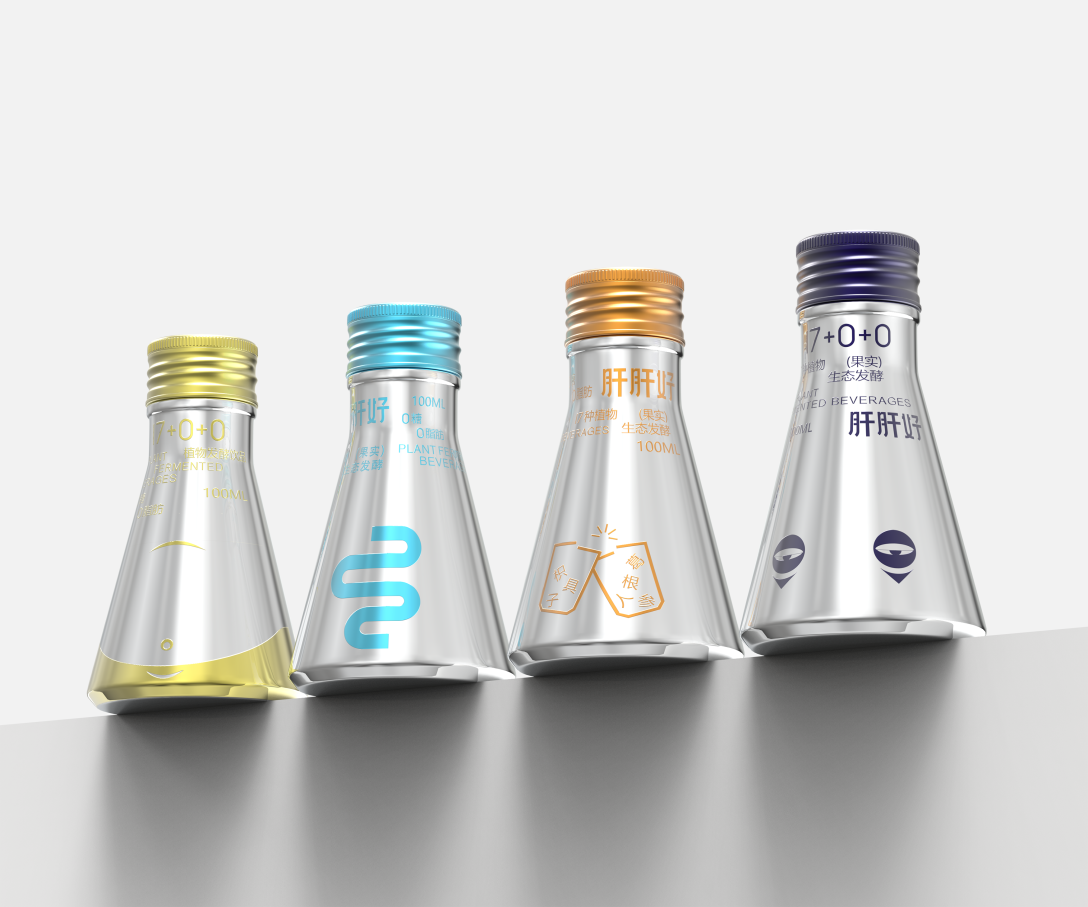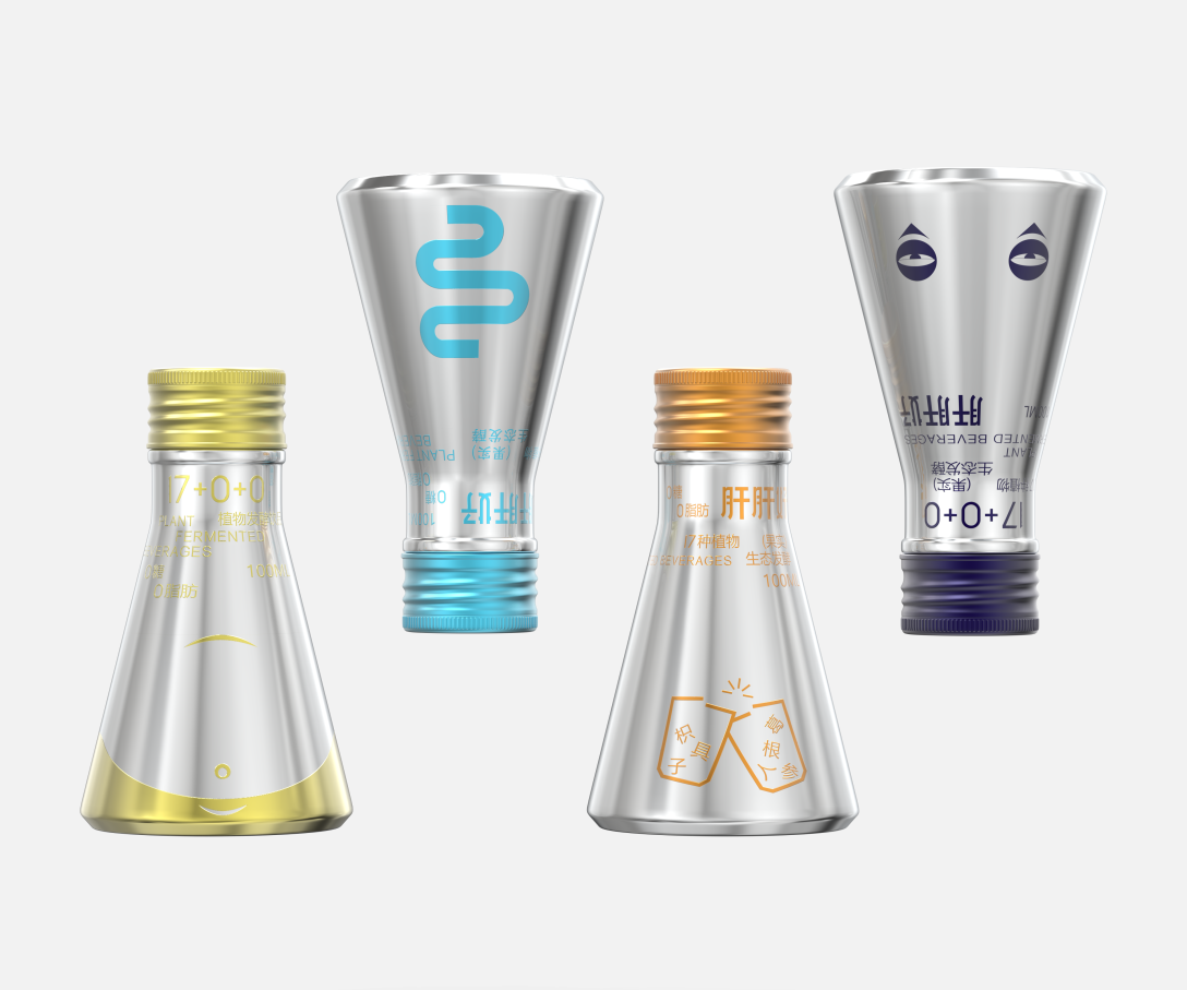 产品瓶身造型模拟实验瓶容器,以银色为主调,将产品功能进行图案符号化处理。这样不仅让每一位用户对其功效能快速产品记忆,并且当我们的困扰被转译为一种具象而又轻盈的视觉符号时,打破严肃的保健饮品形象,展示品牌包装的柔软和关怀;