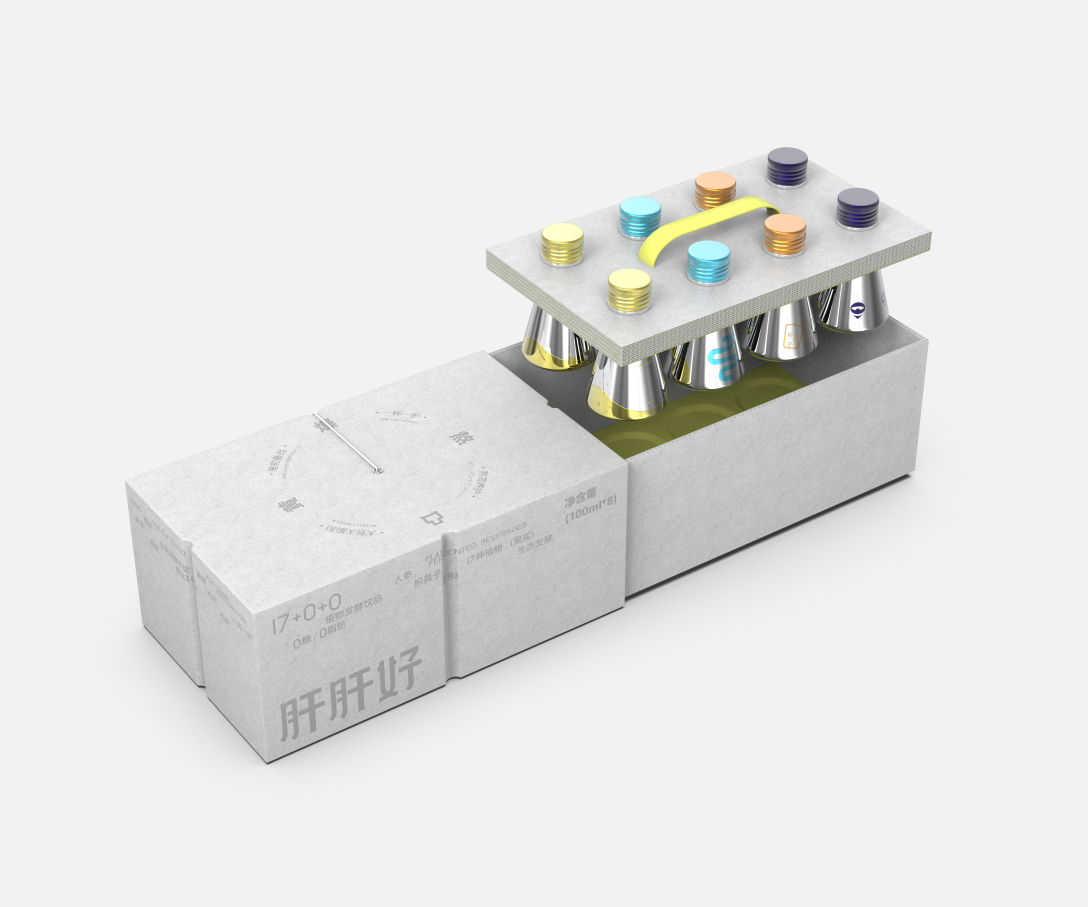 而在外包装盒上采用纸浆材质,又像是给瓶身金属质感带来一丝温暖和自然触感。整体以创造一个具有多种可能性组合的包装设计环境为目的,完美演绎“保健饮品也能高级”的设计美学。