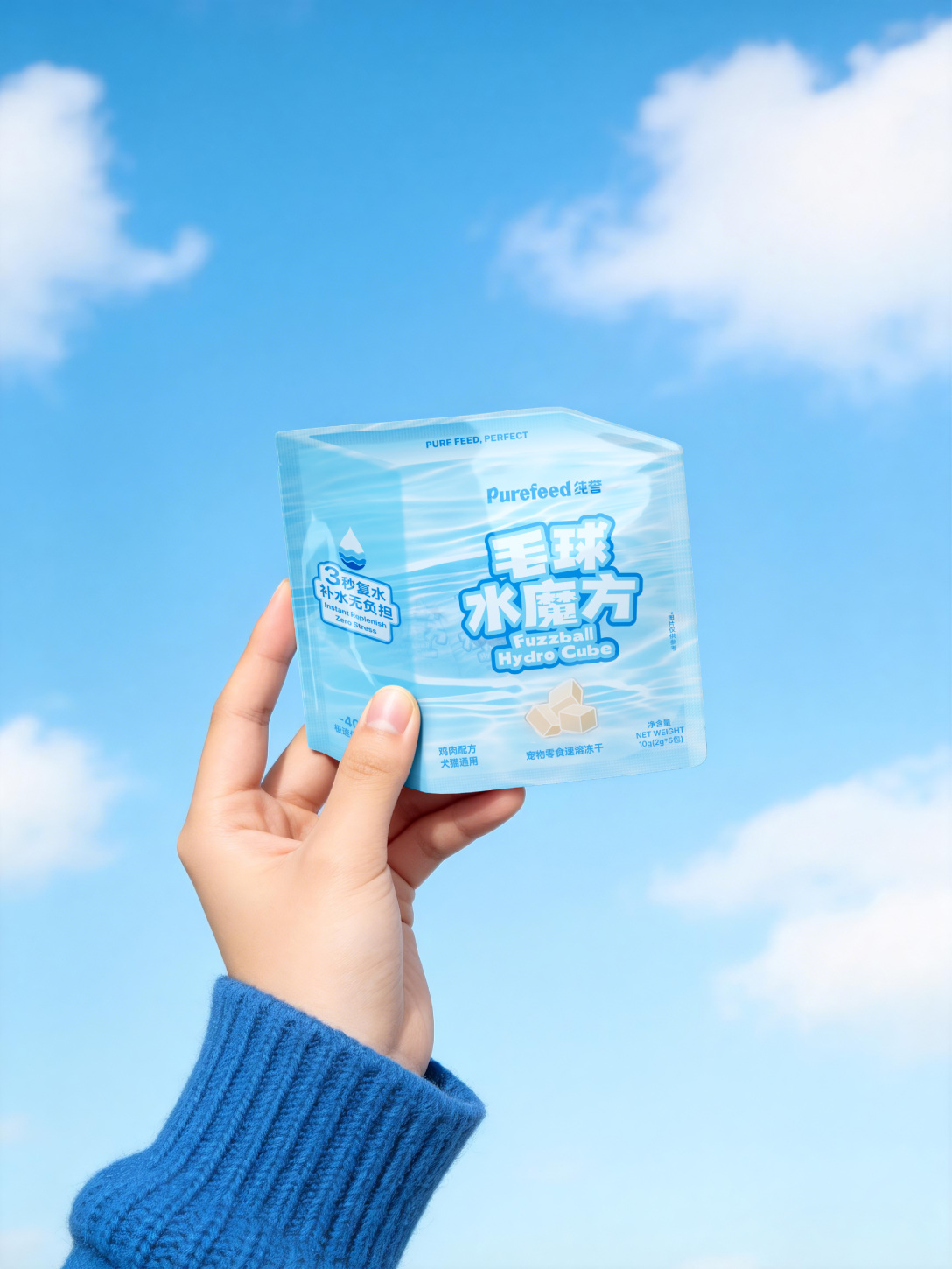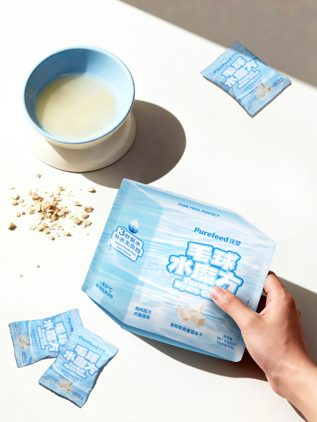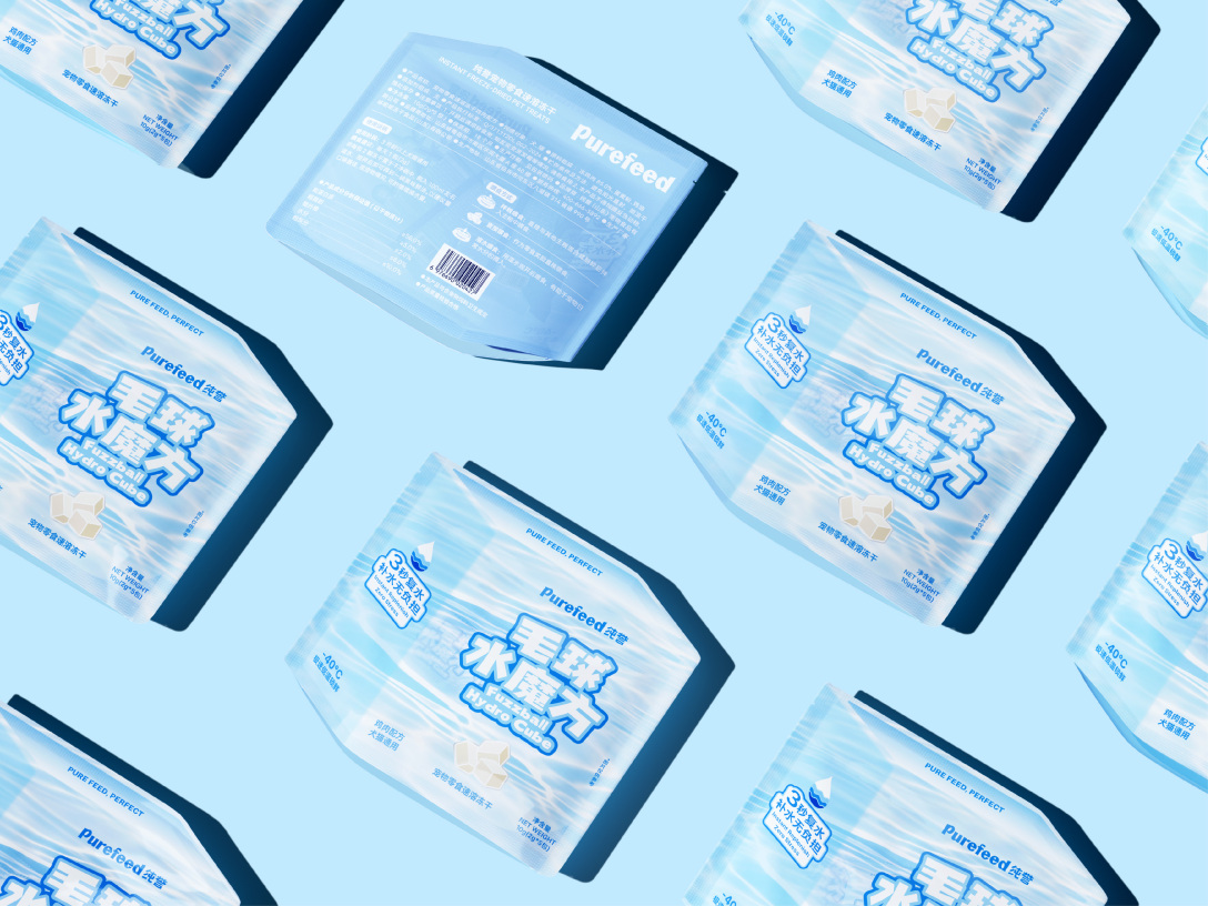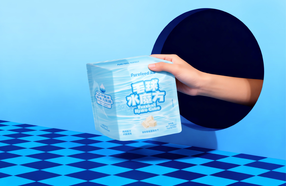 在视觉设计上,我们围绕产品的核心概念 “水魔方” 展开创意。包装采用异形袋结构,通过明暗面的对比塑造立体“魔方”造型,使包装本身成为品类记忆点。同时,底图以流动的水波纹理为视觉背景,营造出清澈、纯净的水感氛围,直观传达产品“溶水即化、轻松补水”的功能特性。