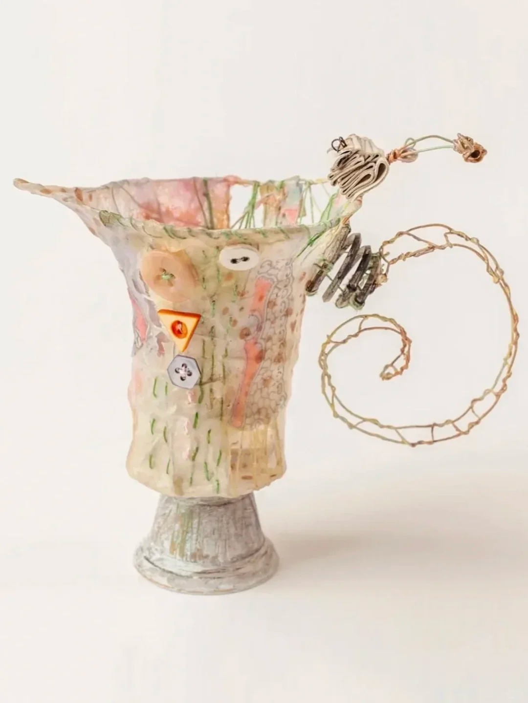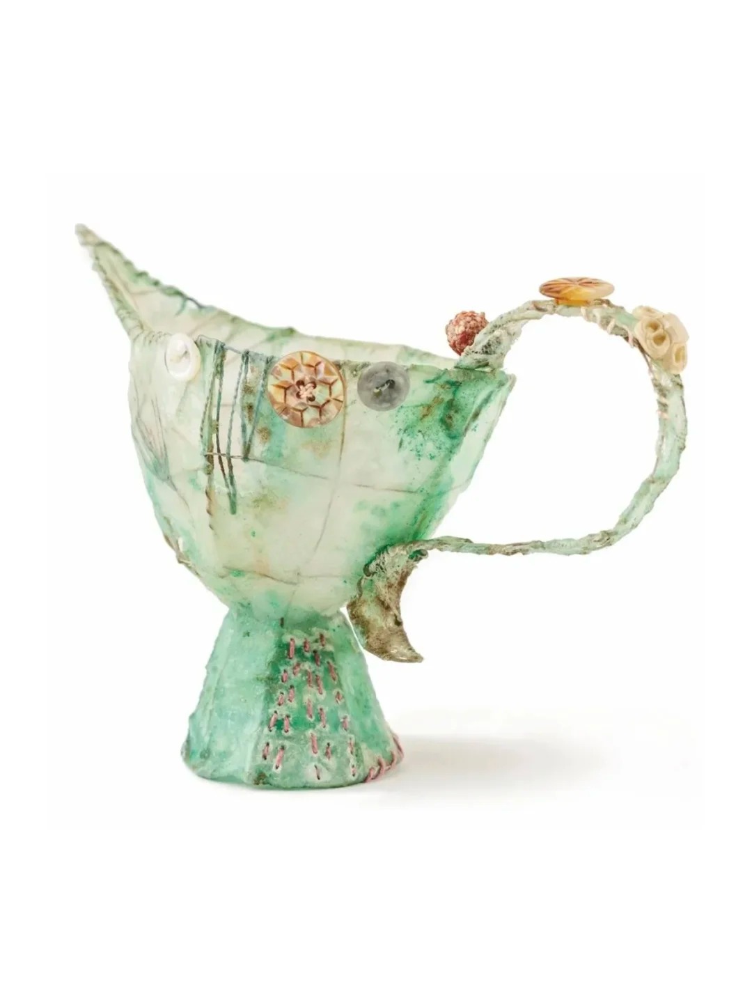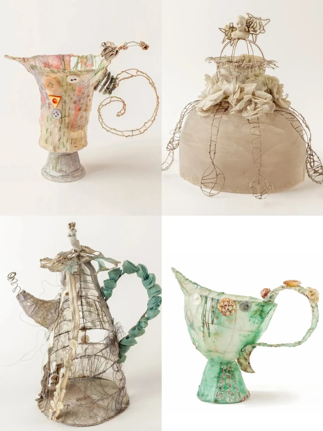 英国纺织艺术家Priscilla Edwards,自称“囤积者、缝纫者、雕塑家”。 她的创作从收集开始。旧布料、生锈的纽扣、缺角的陶瓷碎片,用铁丝搭出骨架,布料包裹,一针一线缝出纹理,最后用蜡封住。一件带着童话气息的雕塑就诞生了。 她的作品像下午茶桌上被施了魔法的茶杯,像旧衣柜里藏着的小人国世界,古怪、可爱,又带点说不清的忧伤。 Priscilla从小就着迷于“修补”。从已有之物里变出新东西,是她理解世界的方式。工作室堆满跳蚤市场淘来的旧物,还有她舍不得丢的任何小东西。 2021年,她把这些年摸索出的方法写成书,叫《Sculptural Textile Art》。有人问她创作的秘诀,她说:“跟着直觉走。如果感觉不对,就拆掉重来。” 她的作品被英国刺绣协会永久收藏。那些从废品里长出来的故事,终于有了自己的位置。